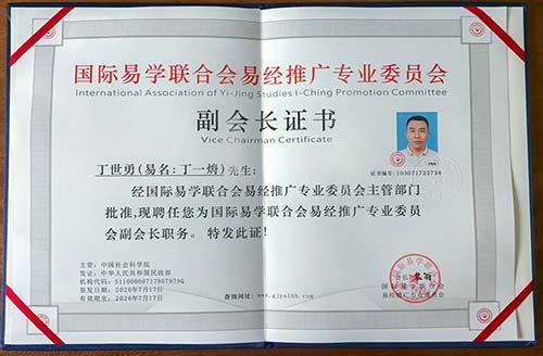 國(guó)際醫(yī)學(xué)聯(lián)合會(huì)易經(jīng)推廣專業(yè)委員會(huì)副會(huì)長(zhǎng)證書(shū)